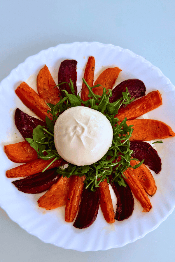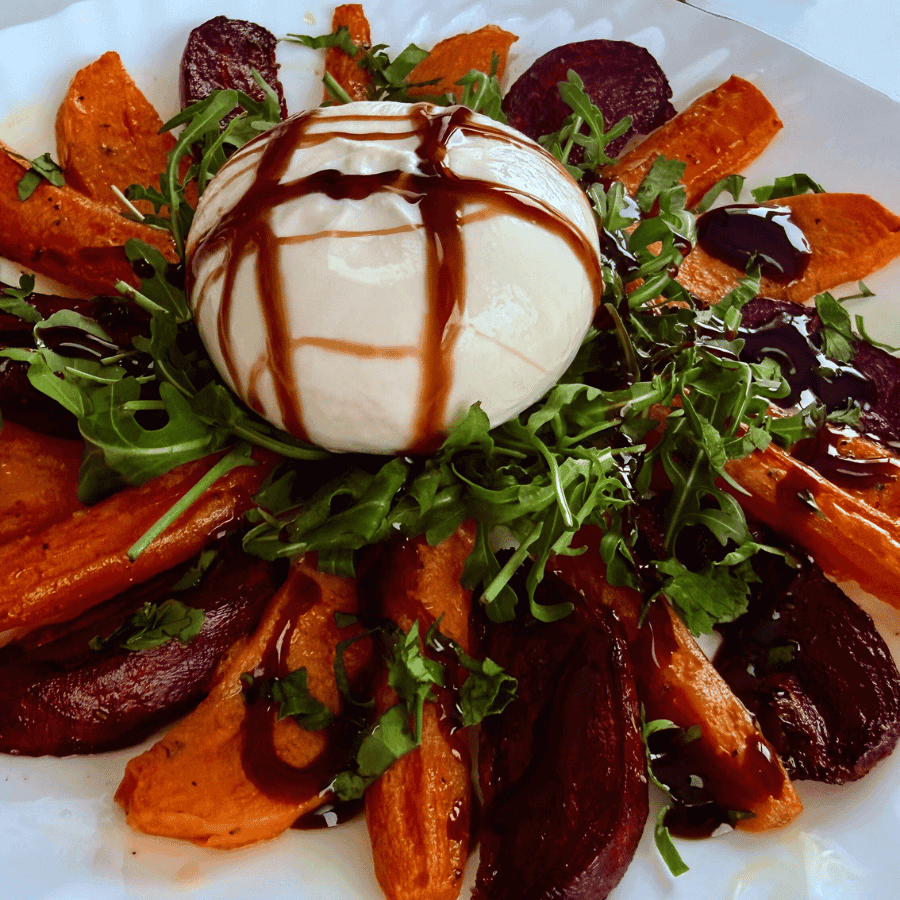 Lėtai keptos morkos, burokėliai ir saldžios bulvės išryškina savo skonį, o šviežia rukola suteikia lengvo kartumo. Visa tai sujungia švelni burrata ir sodrus balzaminis kremas – rezultatas, kuris atrodo kaip restorane, bet pagaminamas namuose.