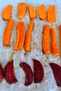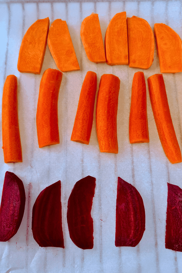 - Paruoškite daržoves:– Morkas supjaustykite išilgai.– Burokėlius ir saldžią bulvę supjaustykite skiltelėmis.