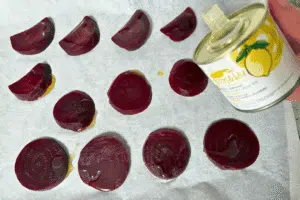 - Paruoškite kepimui:– Sudėkite burokėlius į kepimo skardą (išklotą kepimo popieriumi).– Apšlakstykite citrininiu alyvuogių aliejumi.– Pabarstykite biriais prieskoniais: rozmarinu, čiobreliu, druska ir pipirais.– Švelniai išmaišykite, kad viskas pasidengtų.