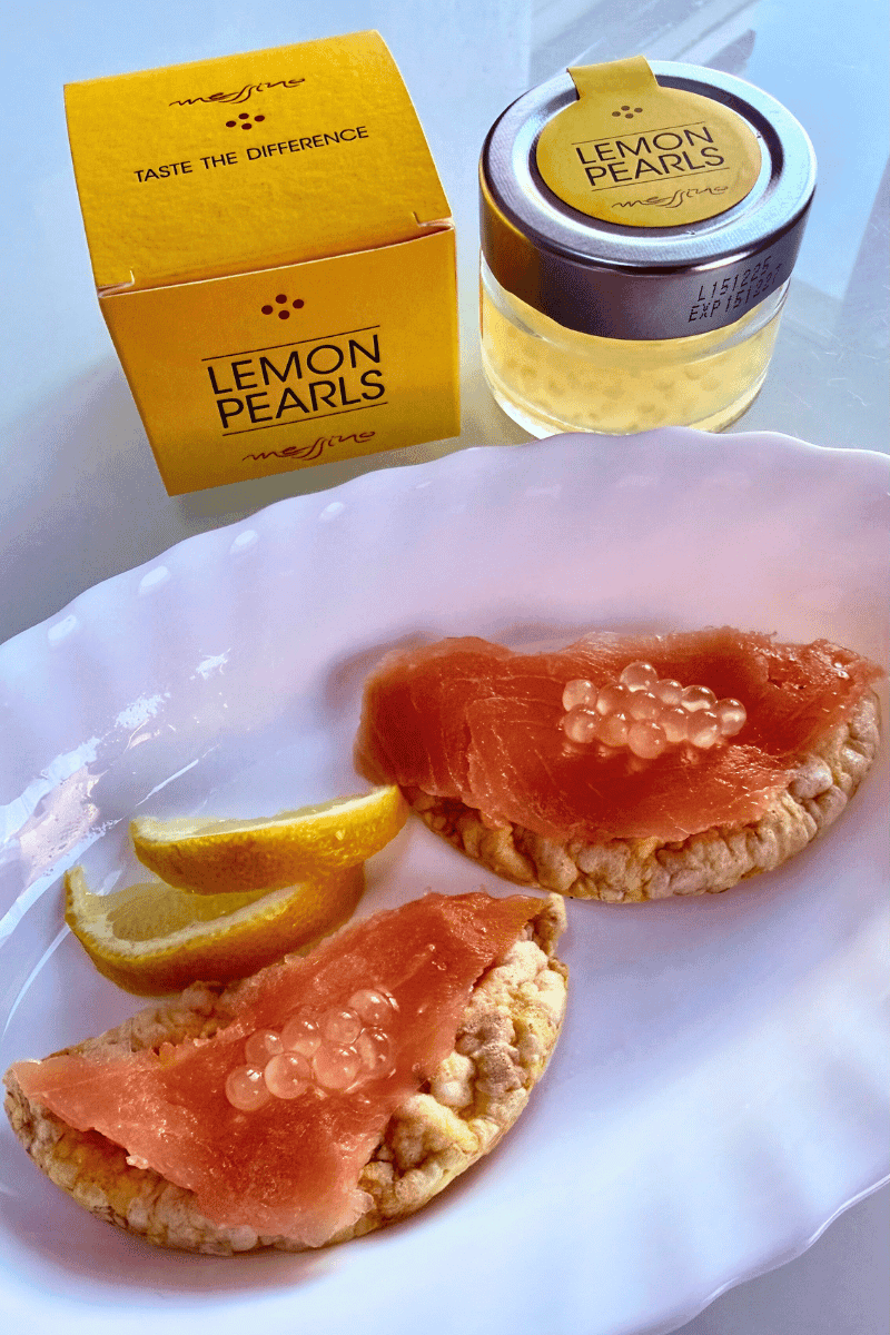 Pastaba: Citrinų perlai pateikiami citrinų sulčių pagrindo skystyje – tai nėra tiršta „ikrų“ tipo konsistencija.