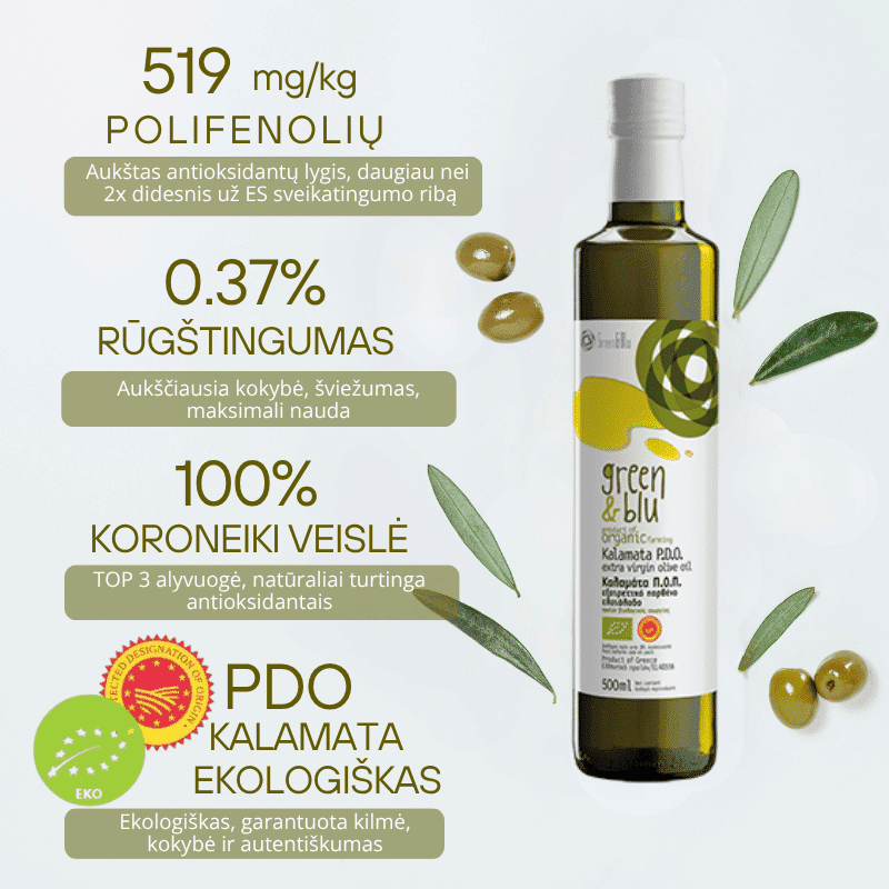 - 100 % Koroneiki – „alyvuogių karalienės“, suteikiančios aromatą, skonį ir ilgesnį stabilumą