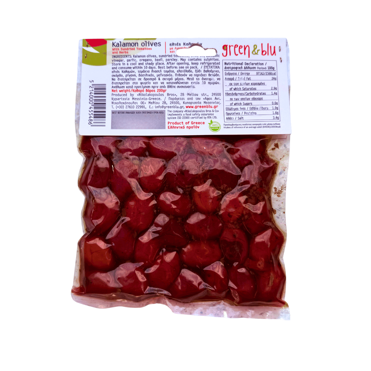 Nesmulkintos juodosios Kalamata alyvuogės, džiovinti pomidorai, alyvuogių aliejus, balzaminis actas, česnakas, raudonėlis, bazilikas, petražolės.