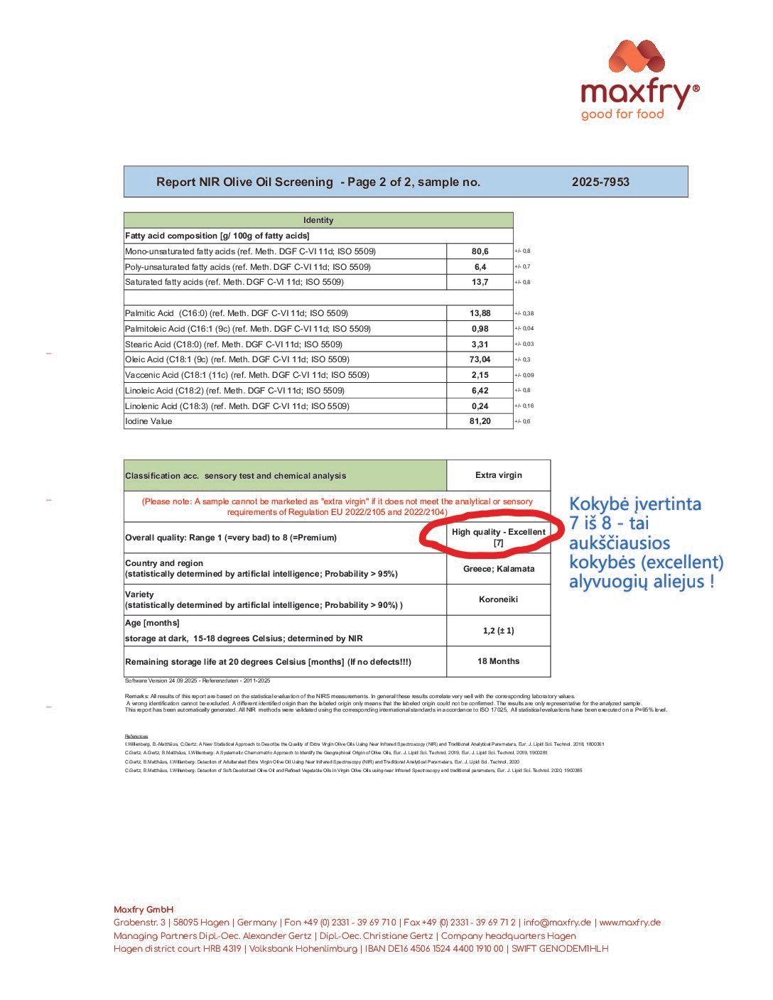 - Be defektų: švarus skonis, atitinka griežtus EXTRA VIRGIN parametrus.