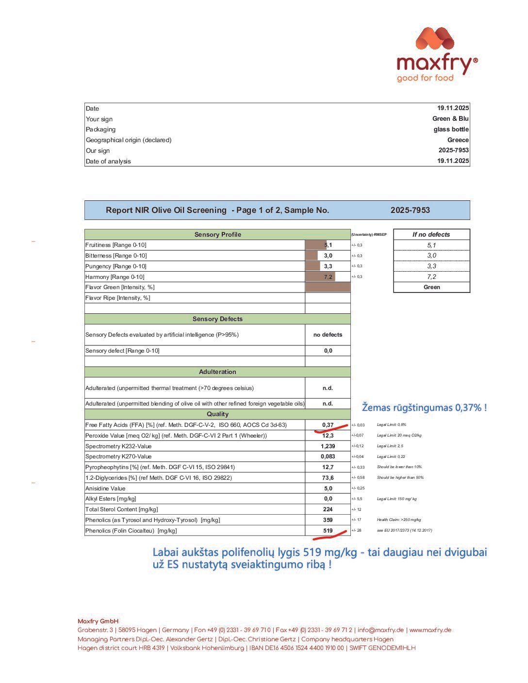 Aukščiausios kokybės EXTRA VIRGIN alyvuogių aliejus iš Kalamata PDO regiono (Peloponesas, Graikija), spaustas žemiau 27 °C, rūgštingumas 0,37 %, polifenoliai 519 mg/kg, subalansuotas vaisiškumas ir elegantiškas pipirinis poskonis.