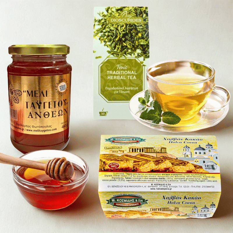 Natūrali energija pavasariui — graikiškas medus, halva ir žolelių arbata. Puikus rinkinys lengvesniems pusryčiams ir ramiems pavasario rytams.