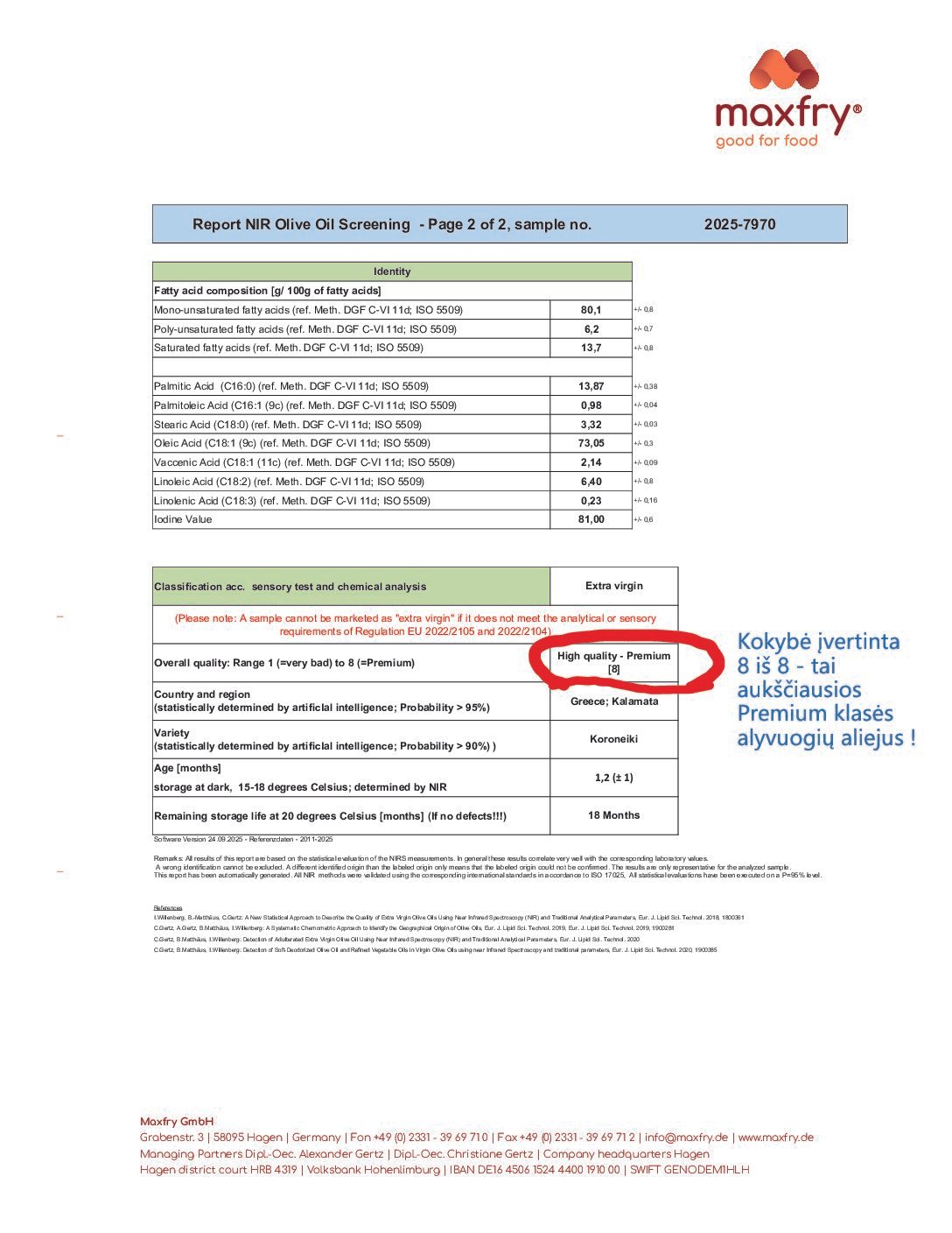 - 100 % Koroneiki alyvuogės – vadinamos „alyvuogių karalienėmis“ dėl intensyvaus skonio ir turtingo maistinių medžiagų kiekio.