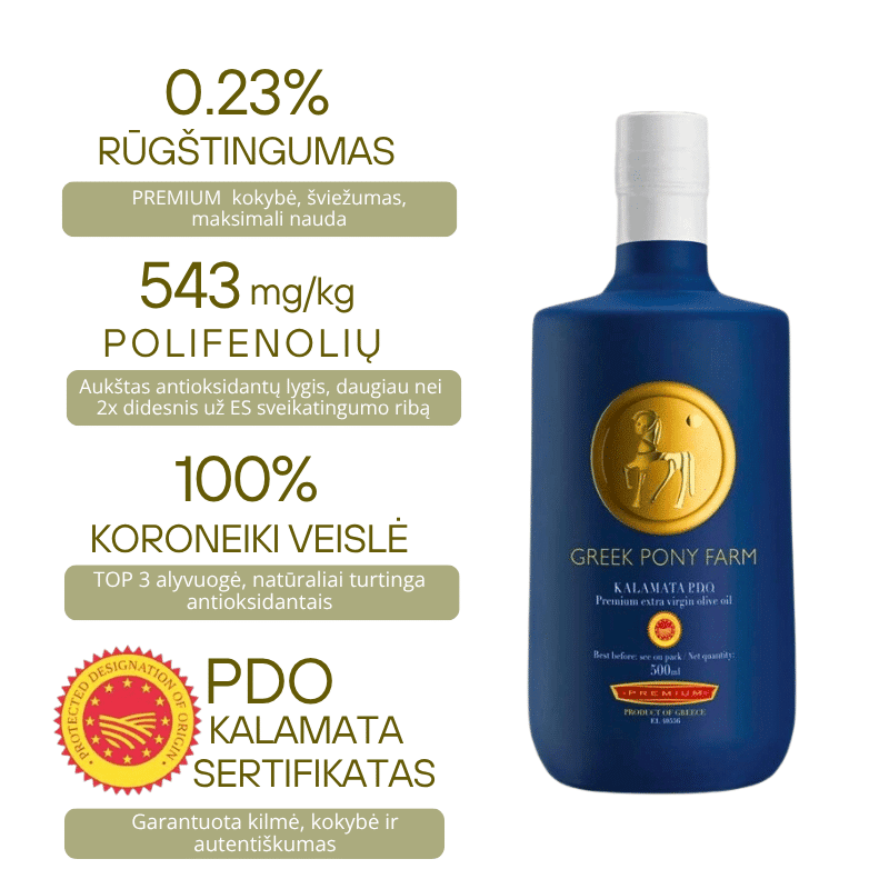 Europos maisto saugos tarnyba (EFSA) patvirtino, kad tik ypač tyro alyvuogių aliejaus polifenoliai „padeda apsaugoti kraujo lipidus nuo oksidacinio streso“. Šios sveikatai naudingos savybės gali būti pasiektos vartojant 20 g ypač tyro alyvuogių aliejaus per dieną, kuriame yra bent 5 mg hidroksitirozolio ir jo darinių, kas atitinka maždaug du valgomus šaukštus. Greek Pony Farm ekologiški PDO Kalamata alyvuogių aliejai atitinka šiuos kriterijus dėl didelio polifenolių kiekio.