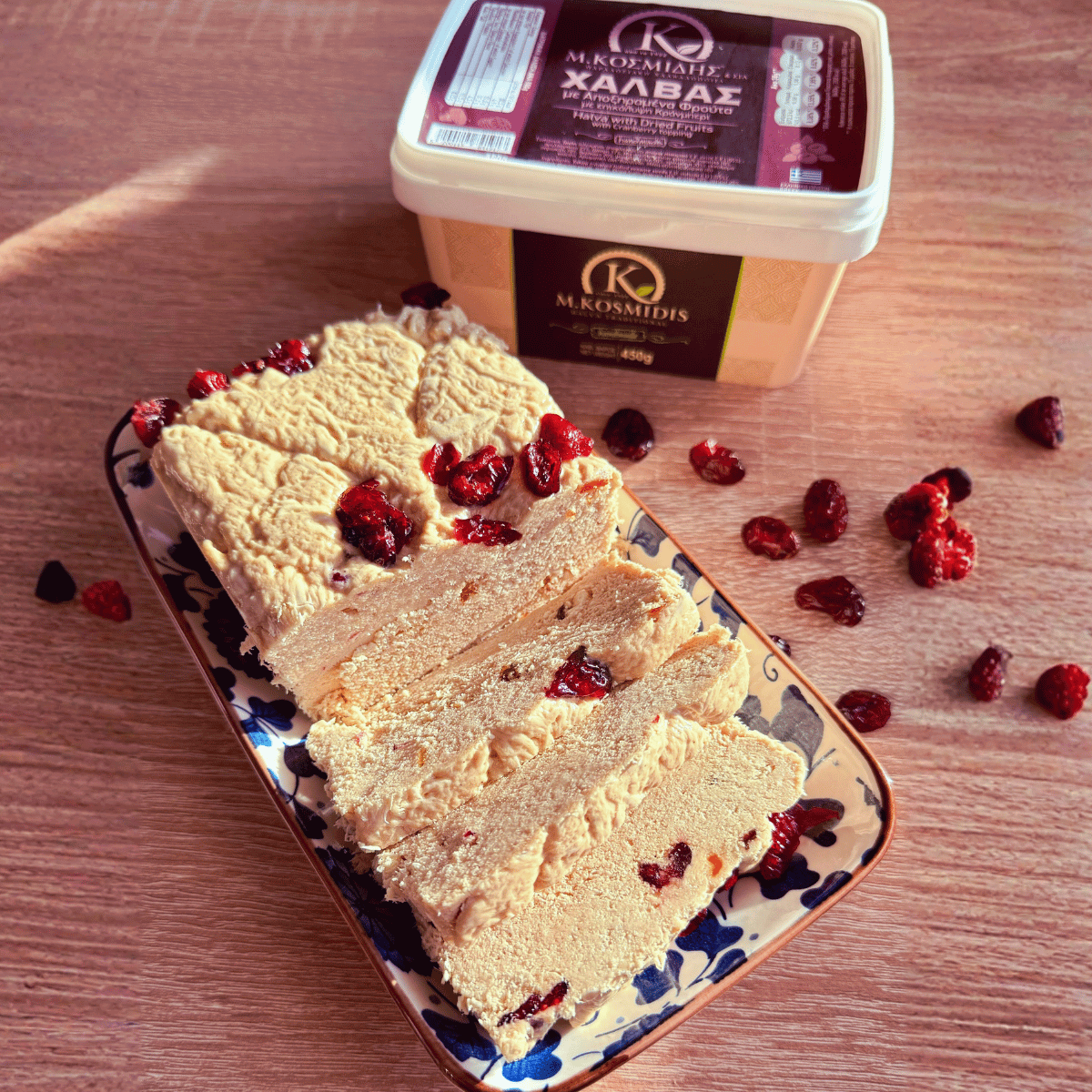 Ši sezamų chalva su džiovintais vaisiais ir spanguolių užpilu – rankų darbo graikiškas desertas,